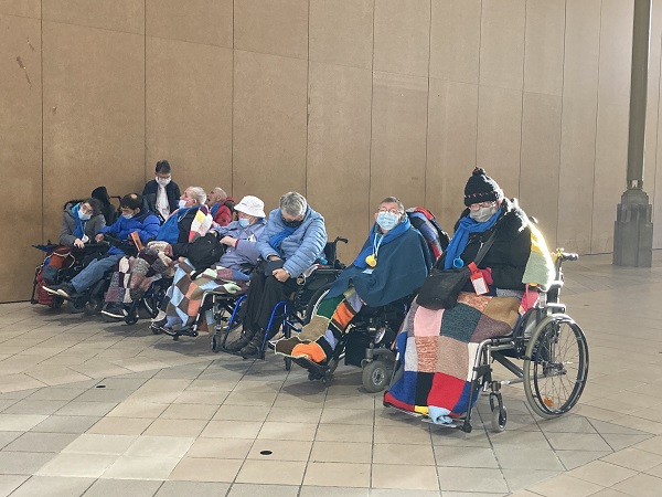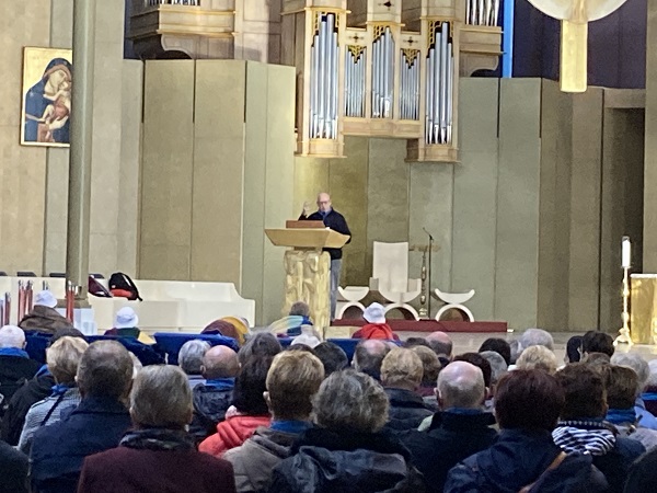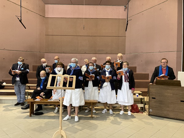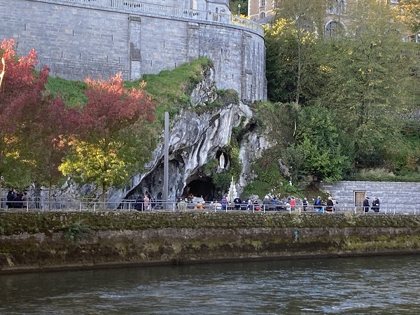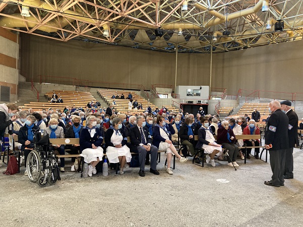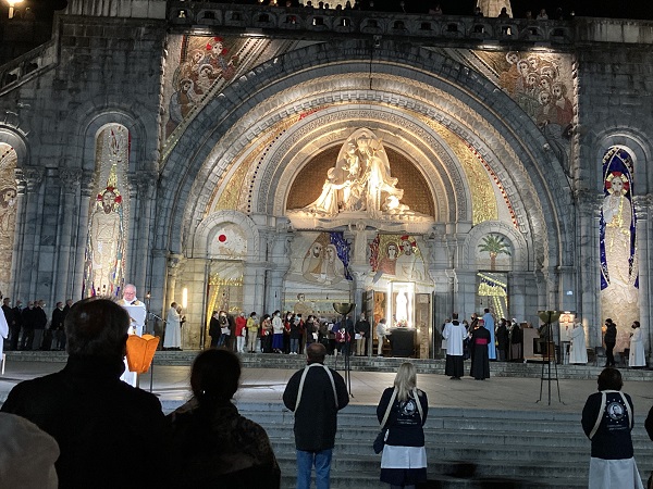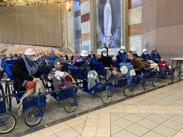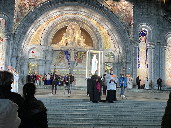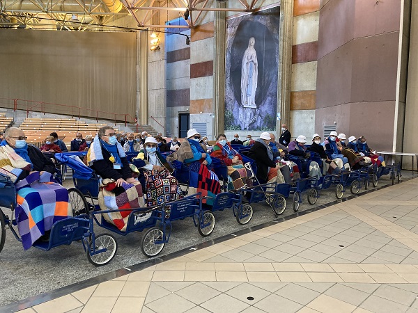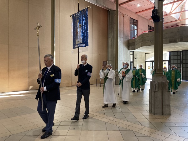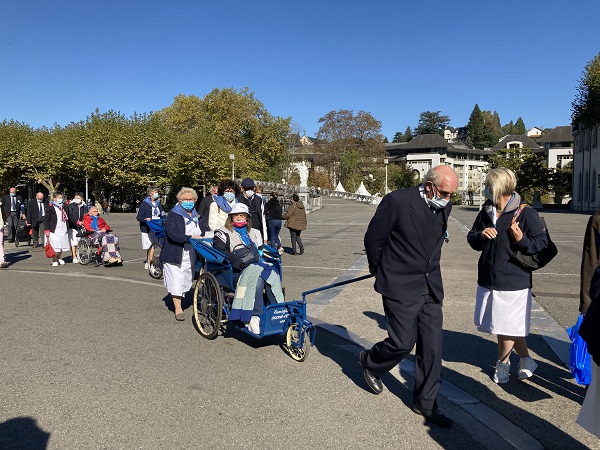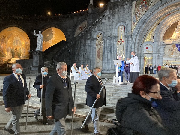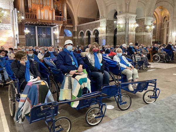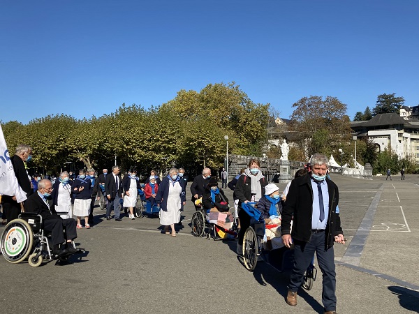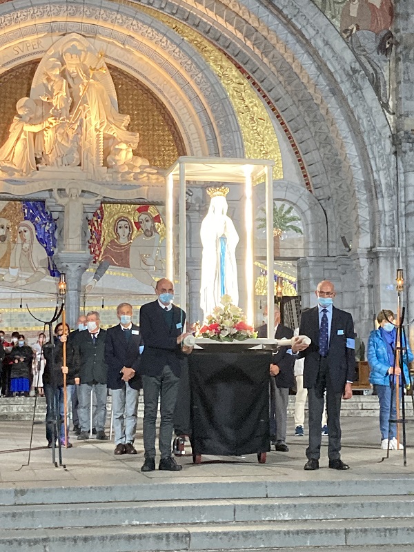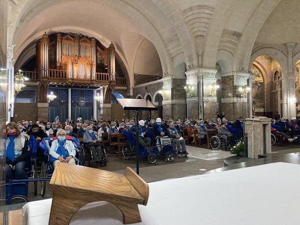 Comme les années passées pour les hospitaliers, la journée débute par la prière en commun dans la cour de l’Accueil Marie Saint Frai. Le contexte sanitaire conduisant à un effectif limité à l’étage, les hospitalières non affectées en salle sont invitées à s’y associer également. C’est le moment de rappeler le programme et les consignes pour la journée : ce matin, la messe est célébrée à Ste Bernadette, cet après-midi, le sacrement du pardon, sera vécu à la Basilique du Rosaire. Nous n’avons pas l’habitude de suivre une célébration dans la Basilique, trop petite pour notre traditionnel pèlerinage. Alors, cette année, c’est l’occasion pour tous d’apprécier les Mosaïques.