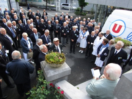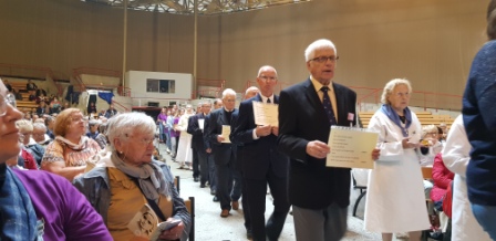 La Procession Eucharistique s’annonce. A l’ombre des arbres, nous attendons le démarrage de la Procession pour nous rendre vers la basilique Pie X. Le diocèse de Vannes est bien présent : 4 hospitaliers portent le dais, et quelques hospitalières les bannières.