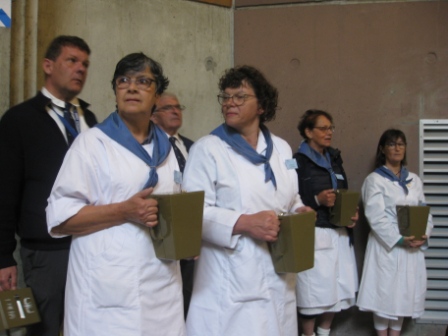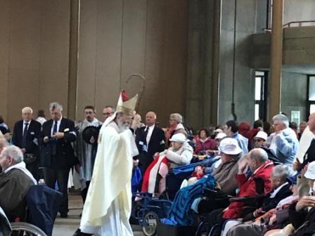 Ce matin, c’est la messe d’onction des malades, c’est toujours un temps fort du pèlerinage. Avec près de 50 malades ou pèlerins recevant l’onction, il ne faut pas perdre de temps pour les placer, et épingler les vêtements de leur nom. Cependant des retardataires se font attendre mais la messe doit commencer.