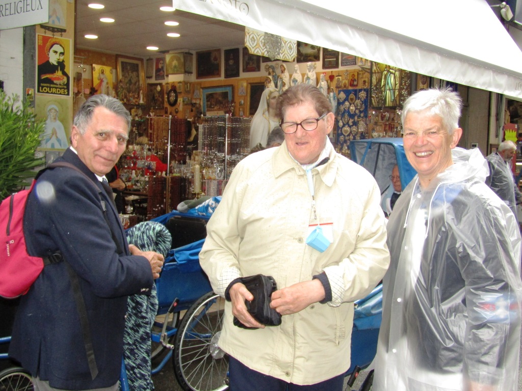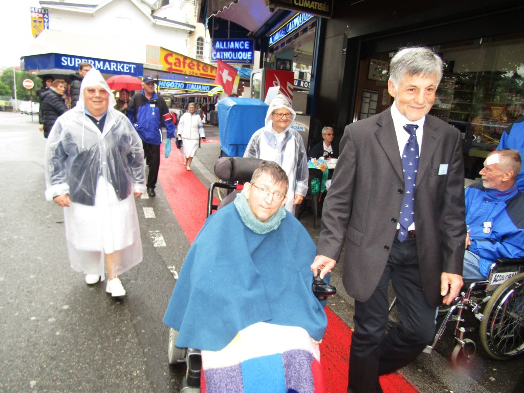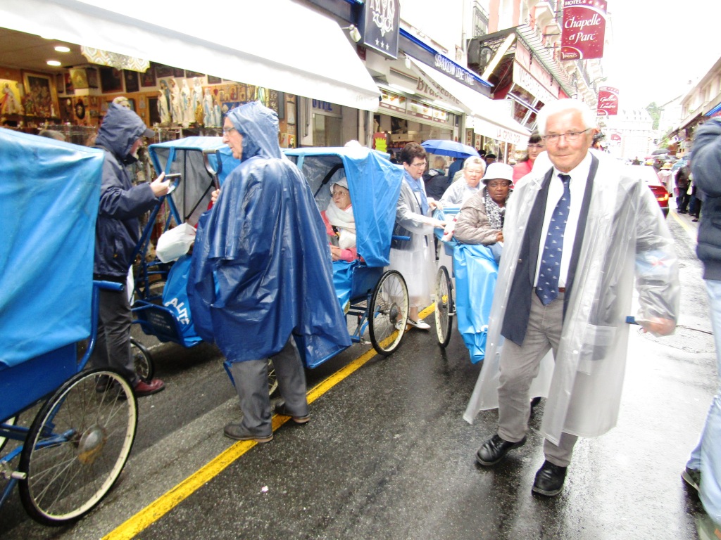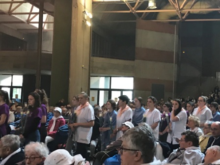 Après un repas bien mérité, puis un petit temps de repos, c’est le départ à nouveau vers les sanctuaires pour le chemin de Croix des malades. Comme le soleil est avec nous, nous pourrons profiter en plein air des stations et des différentes sculptures. Avec le soleil, il ne faut pas oublier de s’hydrate, de mettre le bob. Quelques hospitalières sont présentes auprès des malades, pour veiller au bien-être.
