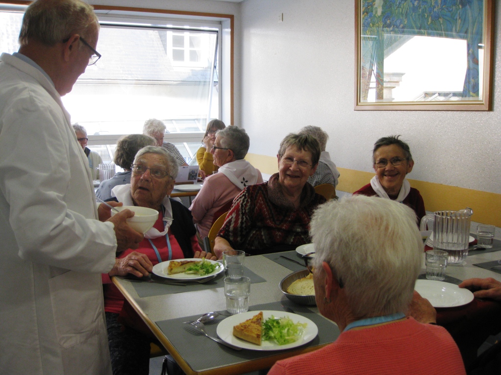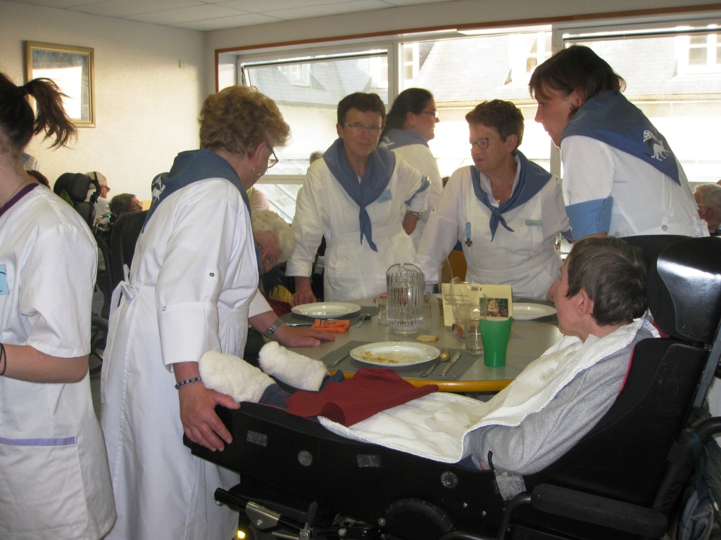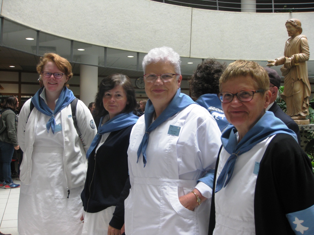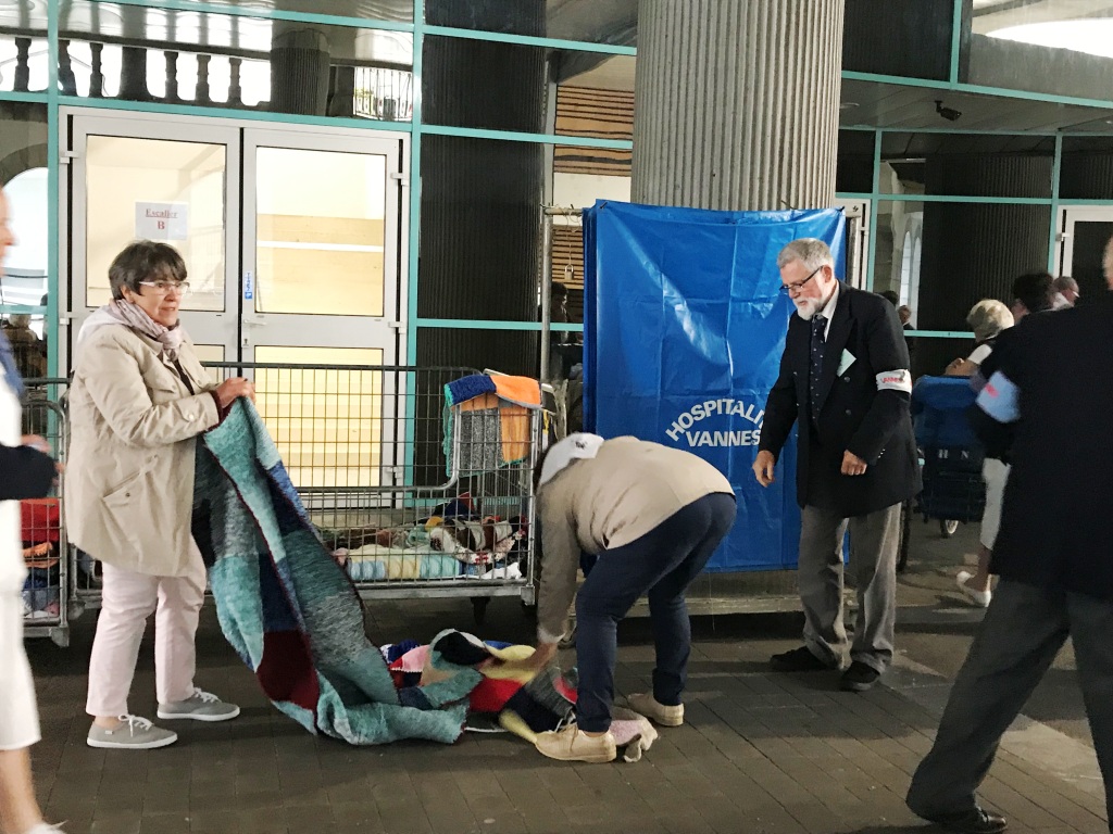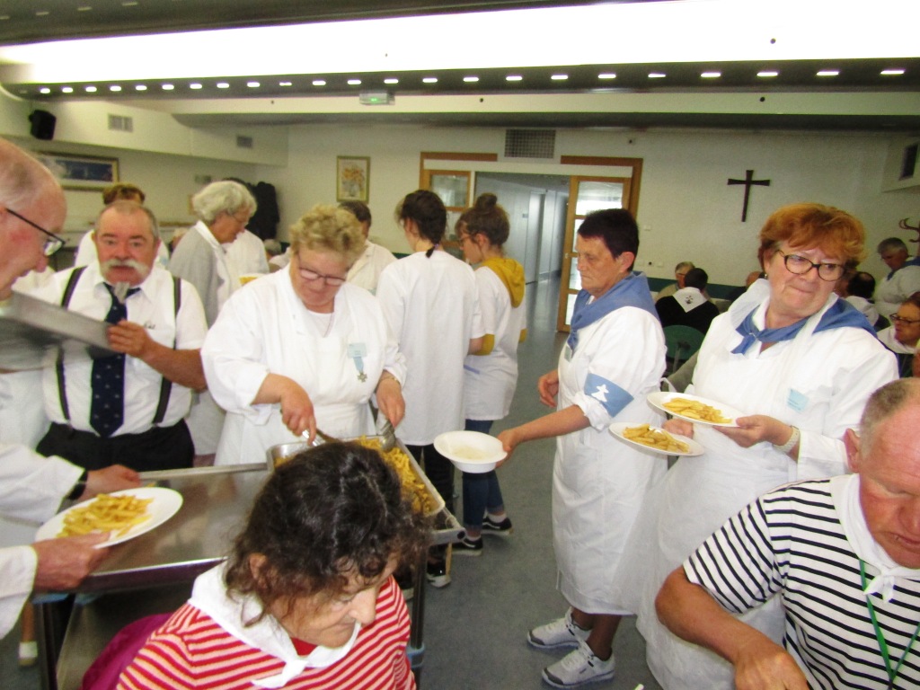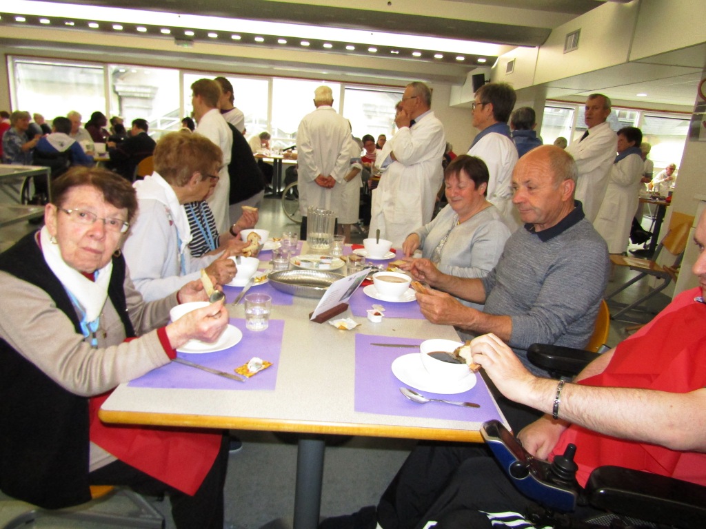 Voilà une nouvelle journée qui commence tout aussi matinale que les premières. Mais vous le savez c’est une habitude à Lourdes. La grasse matinée, nous ne connaissons pas ! Dans la joie et la bonne humeur, chacun rejoint Saint-Frai pour prendre son poste. Pendant que les hospitaliers et hospitalières s’affairent en salle, les hospitaliers de roulage se retrouvent à la Prière avec le Père Collet.