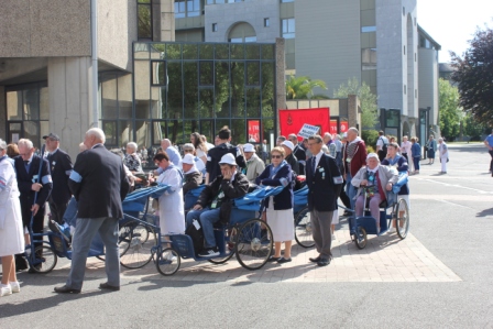Après le repas de midi, c’est un grand déplacement qui se prépare. Les premiers cars arrivent dans le hall de l’Accueil Marie Saint-Frai. Il faut répartir les malades, les hospitaliers et les hospitalières qui les accompagnent dans les cars adaptés. D’autres cars sont disponibles pour tous les autres pèlerins.